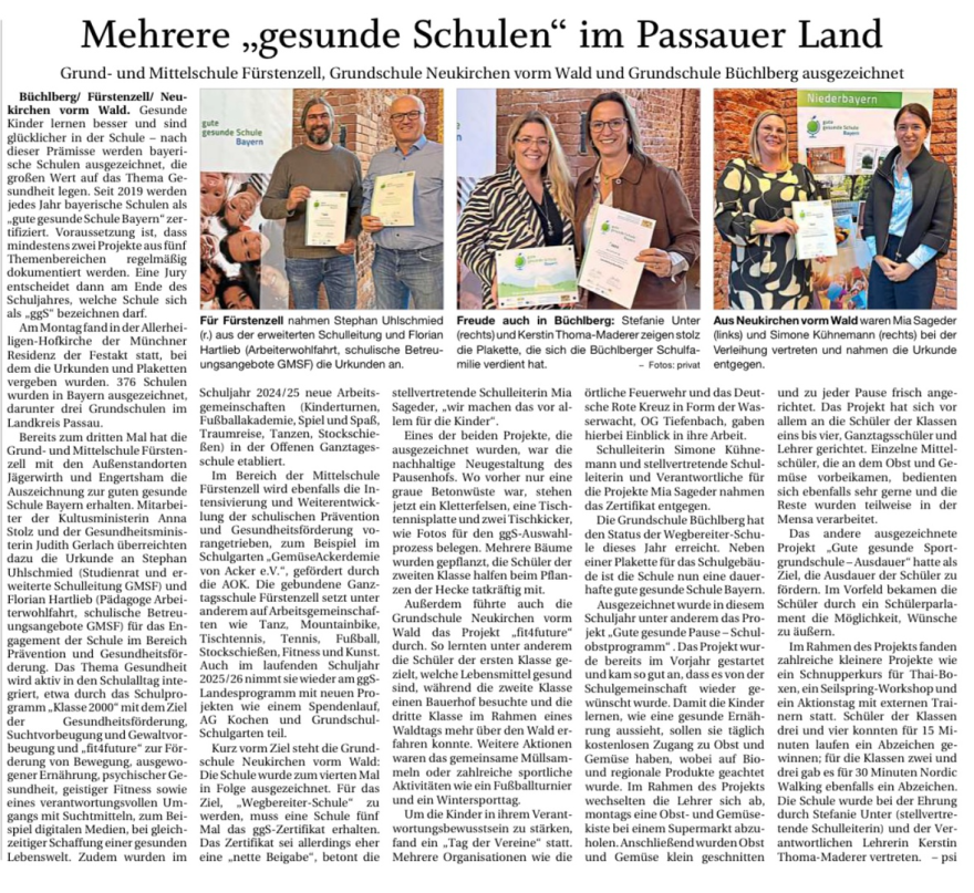 Die Grund- und Mittelschule Fürstenzell hat sich bei den Mädchen in der Wettkampfklasse III/2 (Jahrgänge 2010-2013) den Titel der Niederbayerischen Meisterinnen gesichert! Auf der Sportanlage in Gangkofen traten zunächst die Schülerinnen der Mittelschulen St. Wolfgang Landshut und Gangkofen gegeneinander an. Die Spielerinnen aus Landshut wehrten sich lange Zeit tapfer gegen ihr Alterskolleginnen aus Gangkofen. Schließlich mussten aber die Landshuterinnen die Übermacht anerkennen und die Mädels aus Gangkofen gewannen deutlich 6:0. Im zweiten Spiel traten die Mädels aus Landshut gegen die Grund- und Mittelschule Fürstenzell an. Je zweimal Sara Scaglione und Lena Hasl schossen nach vielen vergebenen Chancen einen souveränen 2:0 Sieg für die Fürstenzeller Mädels um ihren Betreuer Emilio Palluotto heraus. Somit kam es im dritten Spiel fast zu einem echten Endspiel, wobei im Falle eines Untenschiedens das bessere Torverhältnis für die Gangkofener Mädels sprach. Die Fürstenzeller Abwehr stand aber sicher und ließ kaum eine echte Torchance der Gastgeberinnen zu. Sara Scaglione war es schließlich, die das entscheidende Tor zum 1:0-Sieg für die Fürstenzeller Mädels schoss.